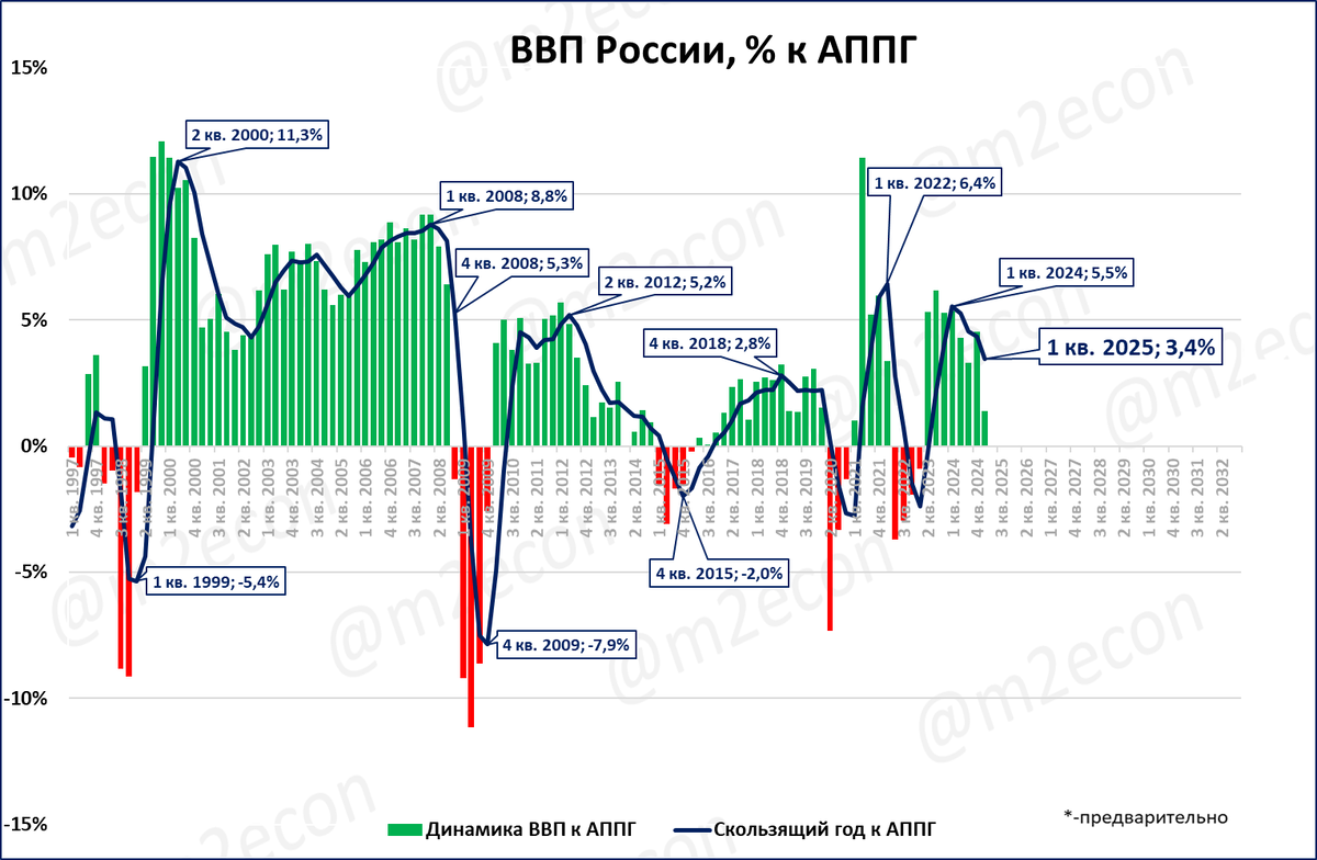 Росстат сообщил, что по предварительной оценке ВВП России в 1 квартале 2025 года вырос на 1,4% к 1 кварталу 2024 года. Для сравнения: в 4 квартале 2024 ВВП вырос на 4,5%.
