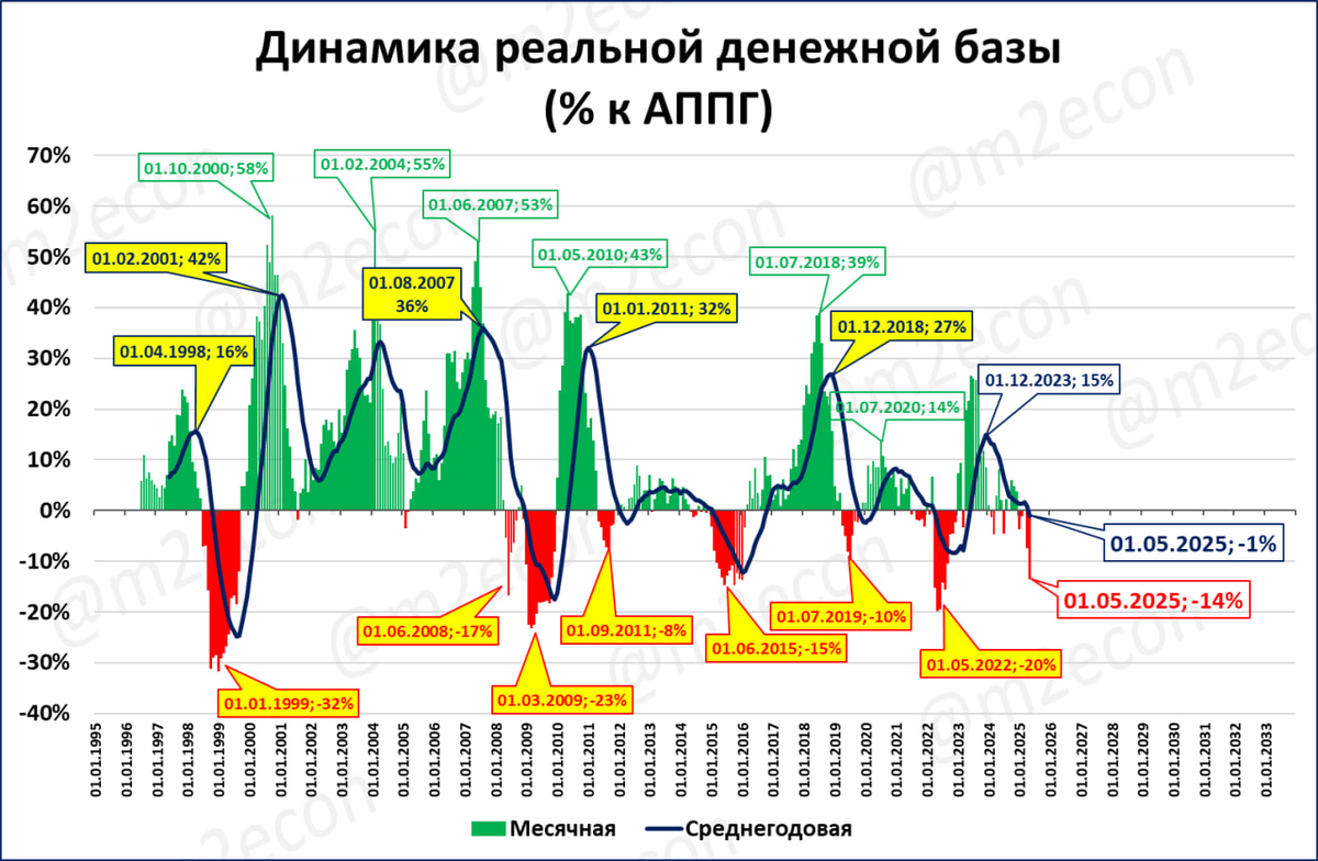 На 1 мая в реальном выражении денежная база сократилась на 14%. При такой политике ЦБ замедление темпов роста, а в худшем случае — падение реальной денежной массы, лишь вопрос времени.