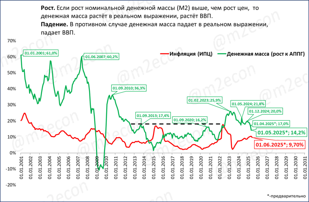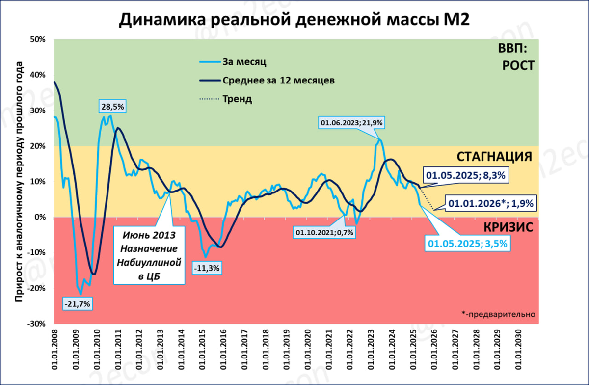 Когда мы делали прогноз ВВП 2025 года, ожидалось (по действующему прогнозу ЦБ), что реальная денежная масса замедлится до +4% годовых только к концу 2026 года. (см. первую картинку из статьи с прогнозом).