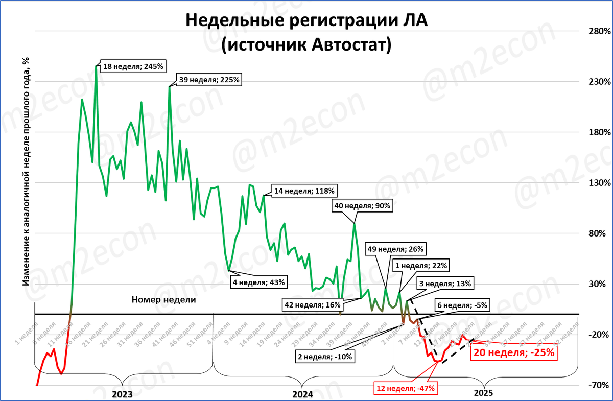 После 12-й недели темпы постепенно улучшаются (второй пунктир). Что падение замедляется, заметно и в месячных данных (см. далее).