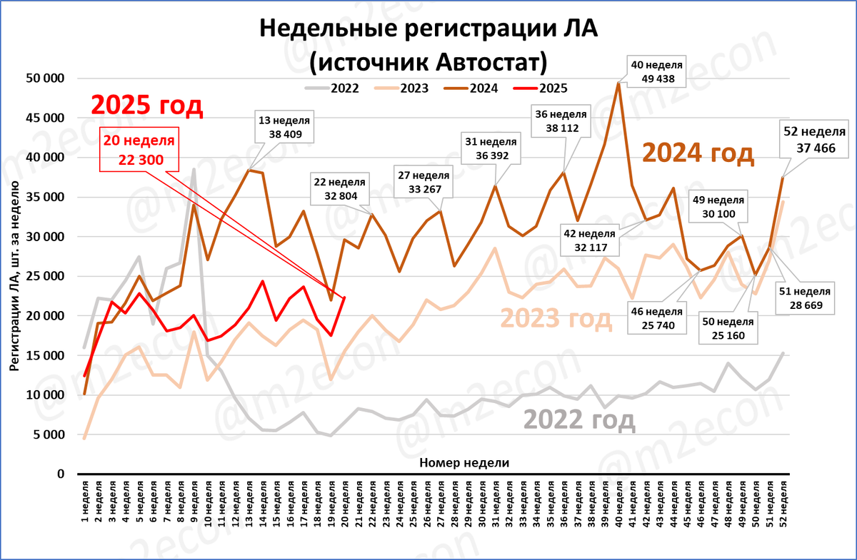 По данным агентства «Автостат», регистрации легковых автомобилей на 20 неделе составили 22,3 тыс.