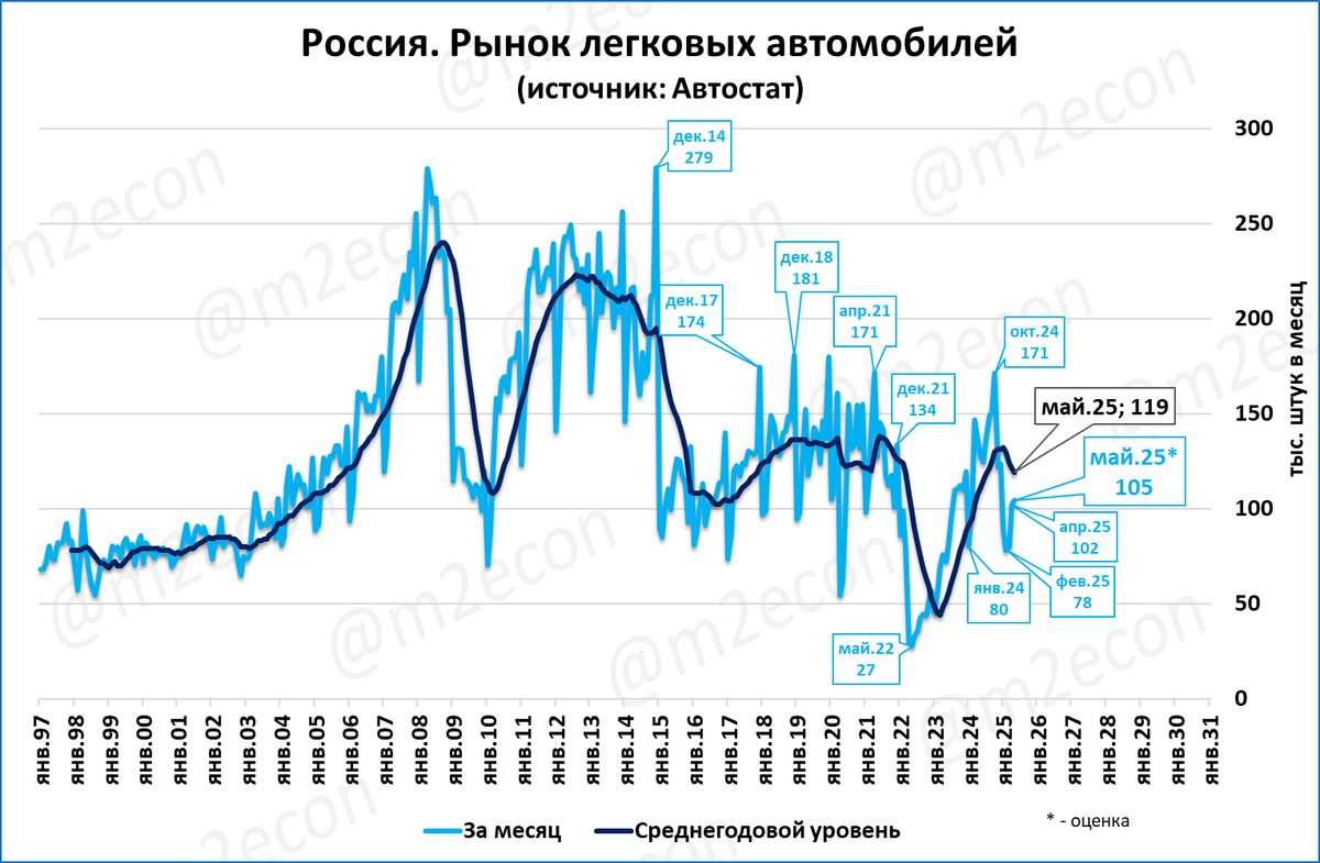 Но если всё-таки принять такую оценку рынка (105 тыс.), то падение в мае составит -18%.