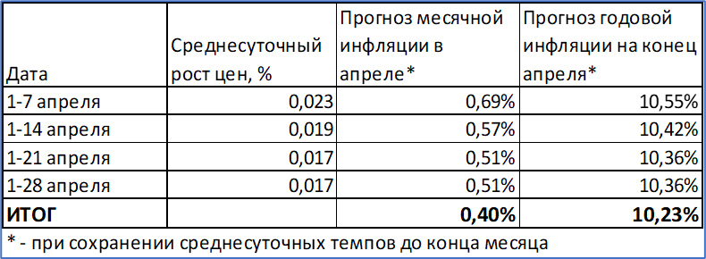 По итогам апреля инфляция, по данным Росстата, снизилась 10,23% годовых (в сравнении с 10,3% по итогам марта).