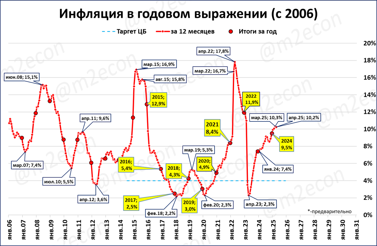 Динамика меняется: то вниз, то вверх, то снова вниз. В таких случаях хорошо помогает среднегодовой темп, показанный тёмно-синей линией на графике. Он прекратил падение и стабилизировался на уровне около 7% годовых.