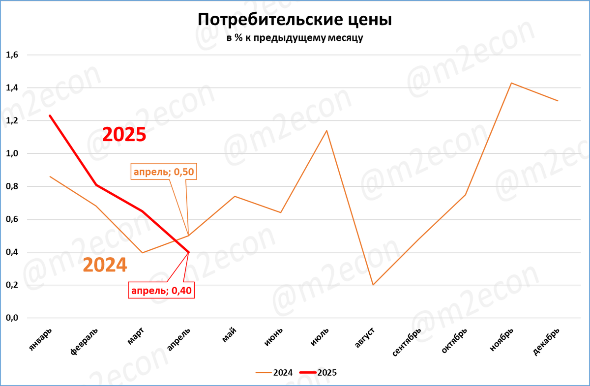 Рост цен за апрель 0,4% (красная линия на графике ниже) ниже, чем в апреле 2024 года (оранжевая линия.