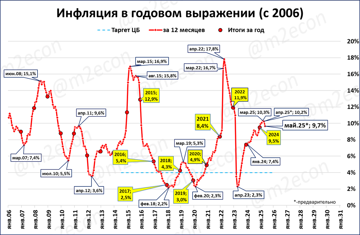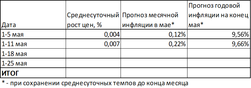 Если такой рост продлится до конца месяца, то инфляция по итогам мая составит 9,7% годовых.
