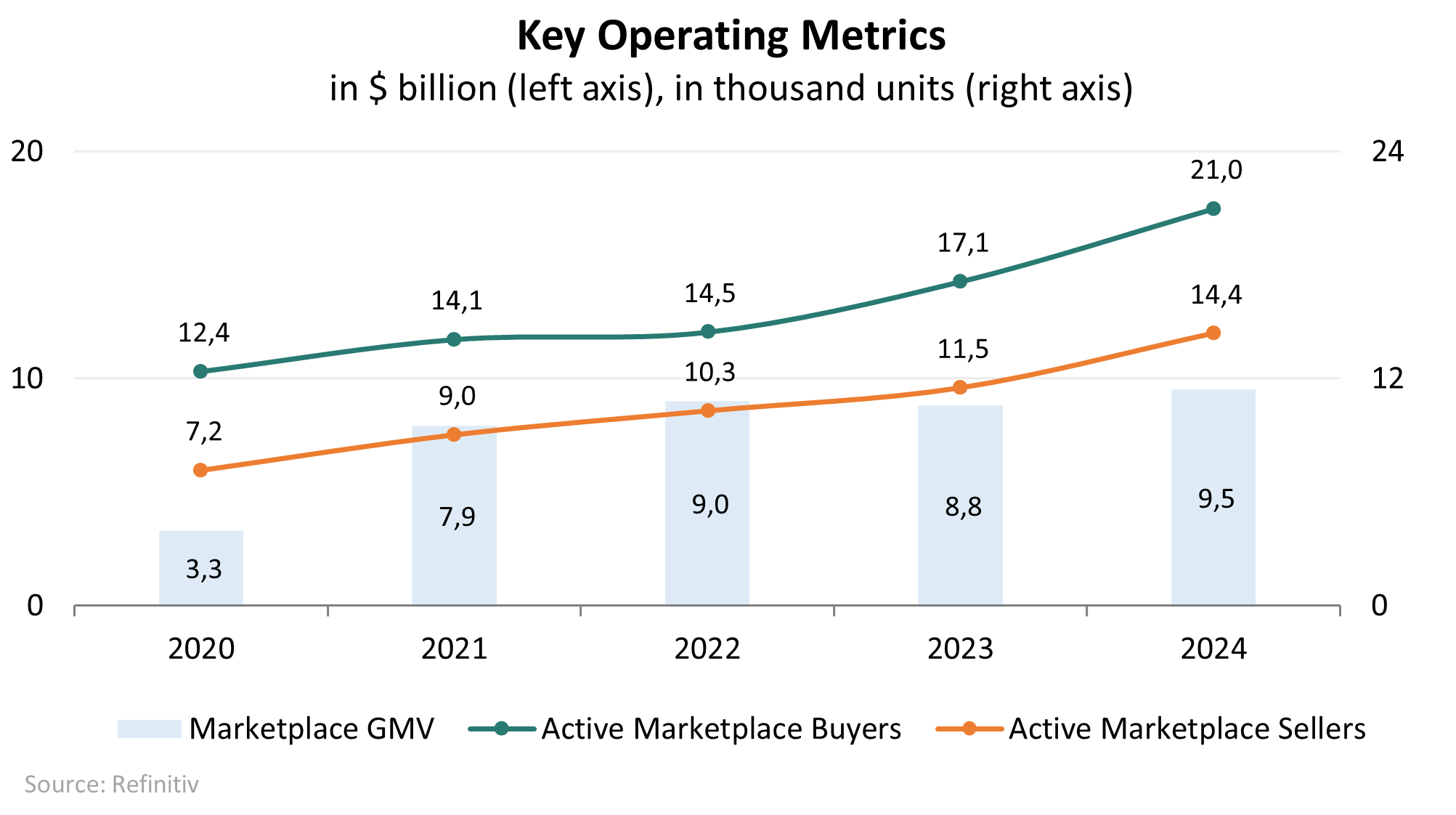 В 2024 году компания продемонстрировала уверенный рост всех ключевых показателей: валовой товарооборот увеличился на 8% по сравнению с предыдущим годом до $9,5 млрд, а число активных покупателей и продавцов на платформе выросло на 22,5% и 25% соответственно.