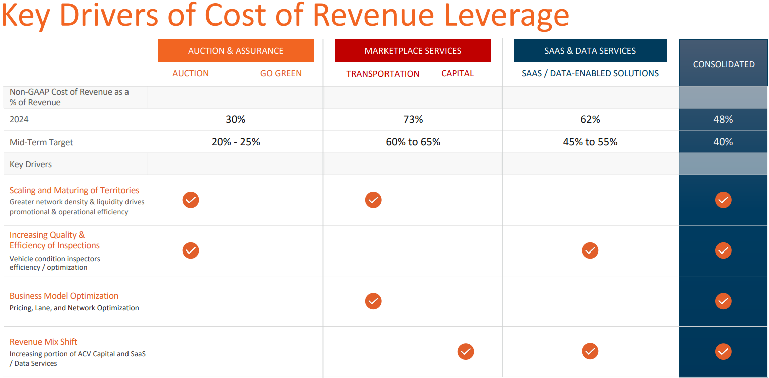 Несмотря на уверенные темпы роста выручки, ключевым вызовом для ACV Auctions остается достижение рентабельности в рамках текущей бизнес-модели. На данный момент себестоимость выручки не-GAAP составляет 48% от общей выручки. Руководство компании поставило цель снизить этот показатель до 40% в среднесрочной перспективе за счет повышения операционной эффективности и оптимизации доходной части. Для этого разработан план, включающий несколько ключевых инициатив: