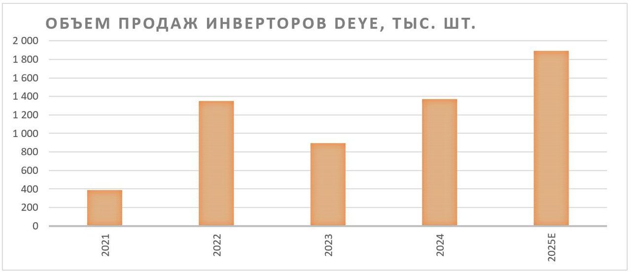 Ключевое направление для Ningbo Deye Technology — продажа инверторов. Инвертор необходим на каждой солнечной электростанции, домашней и промышленной, что приводит к росту спроса на инверторы на фоне развития солнечной энергетики в Китае и развитых странах. На этом фоне по итогам 2024 года продажи инверторов Deye увеличились более чем на 50% г/г, до 1,4 млн шт. Ожидаем, что на фоне растущего спроса и ввода дополнительных производственных мощностей рост продаж продолжится, хотя и более низкими темпами, чем в 2024 году.