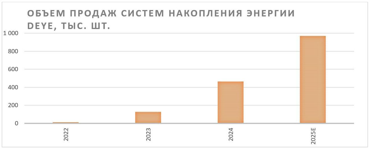 Наиболее растущее направление бизнеса Ningbo Deye — производство и продажа систем накопления энергии, которые используются как на домашних, так и на промышленных солнечных электростанциях, причем в последние годы компания активно расширяет присутствие в промышленном сегменте. Солнечная генерация является нестабильной из-за погодных условий, в связи с чем тема накопления энергия все более актуальна для отрасли. На этом фоне по итогам 2024 года Deye нарастила продажи систем накопления энергии в 3,6 раза г/г, а в текущем году мы ожидаем роста более чем в 2 раза. При этом отметим, что еще в 2022 году продажи были почти на два порядка ниже прогнозного уровня 2025 года.