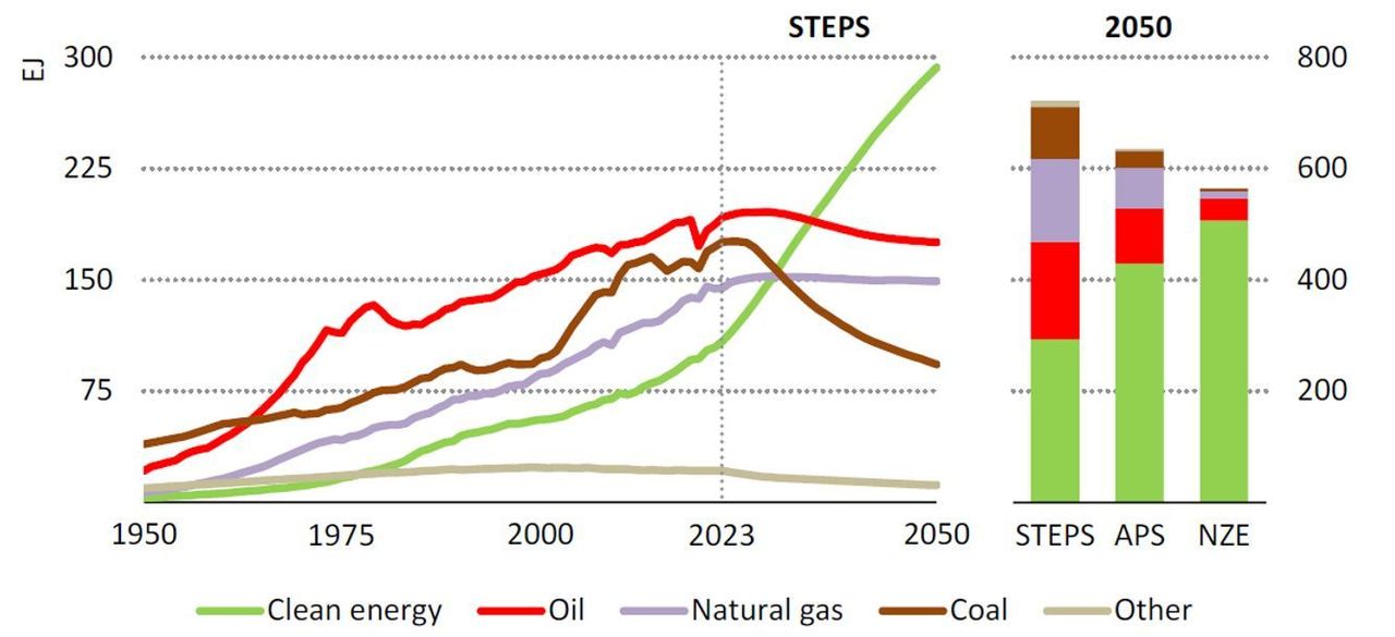 Динамика энергобаланса в базовом сценарии (STEPS) и энергобаланс в 2050 году в зависимости от сценария, ЭДж