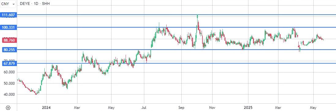 С технической точки зрения на дневном графике акции Ningbo Deye Technology торгуются в среднесрочном боковике с границами у отметок RMB 80 и RMB 100. В такой ситуации направление выхода из боковика может задать вектор для дальнейшего движения.