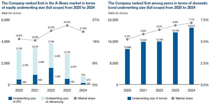 Благодаря большому опыту работы на рынке капитала, хорошей репутации и сильному бренду, масштабу деятельности CITIC Securities в последние годы прочно удерживает первое место на рынке организации привлечения юаневого финансирования в КНР. Преимуществом CITIC Securities является поддержка со стороны основного акционера, благодаря которой компания может получать выгодные контракты на оказание инвестбанковских и других финансовых услуг госпредприятиям и госструктурам. Однако деятельность CITIC Securities далеко не ограничивается госсектором, среди ее клиентов — ведущие представители практически всех отраслей экономики, включая, например, техгигантов Alibaba, Baidu, JD.com.