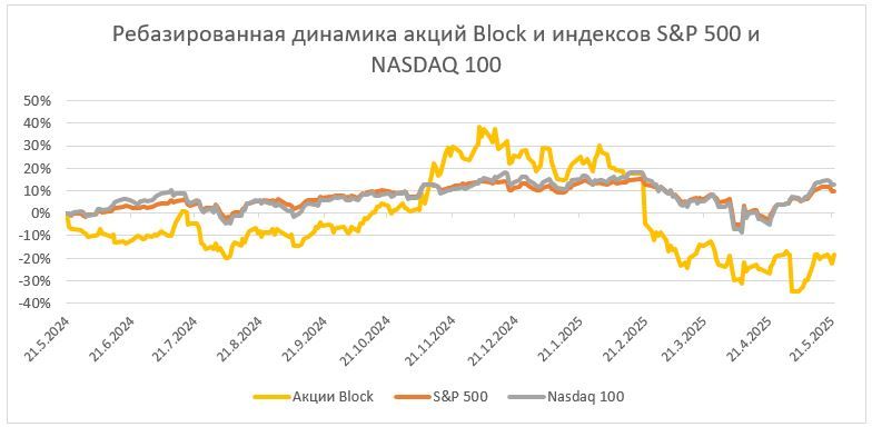 На протяжении последних 12 месяцев акции Block заметно отстают от бенчмарков американского фондового рынка (снижение на 18,4% при росте S&P 500 на 9,7% и NASDAQ 100 на 12,8%).