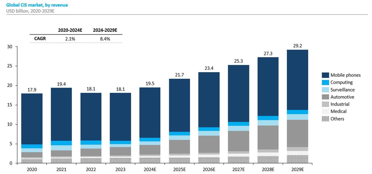 Рынок КМОП-фотоматриц (CIS) сохраняет стабильные темпы роста: по оценкам Frost & Sullivan, в 2024–2029 гг. среднегодовой прирост составит около 8,4%. Основным драйвером в ближайшие годы станет активное внедрение КМОП-матриц в автомобильной промышленности, в частности, благодаря развитию усовершенствованных систем помощи водителю (ADAS) и переходу к автономному вождению. Дополнительную поддержку росту оказывают сферы видеонаблюдения и промышленной автоматизации, где возрастает спрос на надежные и энергоэффективные сенсоры. Тем не менее, несмотря на расширение областей применения, общий темп роста может быть сдержан из-за стагнации на зрелом рынке смартфонов, который традиционно является одним из крупнейших потребителей КМОП-матриц. Так, по оценкам Frost & Sullivan, среднегодовые темпы роста рынка КМОП-фотоматриц для смартфонов в 2024–2029 гг. составят 3,6%, в то время как в области решений для автомобилей рынок будет расти в среднем на 23% в год, в области решений для безопасности — на 10,5% в год, а в области медицины — на 21% в год.