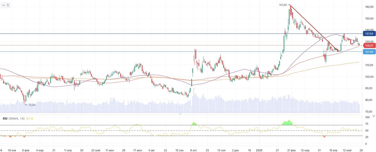 На дневном графике заметна значительная коррекция котировок Will Semiconductor после февральского ралли. Однако к концу апреля бумаги смогли переломить нисходящий тренд и закрепиться в диапазоне CNY 125–137. Ближайшим ориентиром для возможного отскока выступает 100-дневная скользящая средняя в районе CNY 126. От нее может начаться восстановление с потенциальной целью на уровне 50-дневной скользящей средней, проходящей вблизи CNY 130. В случае пробоя этого уровня техническое восстановление может продолжиться до зоны сопротивления в районе CNY 137.