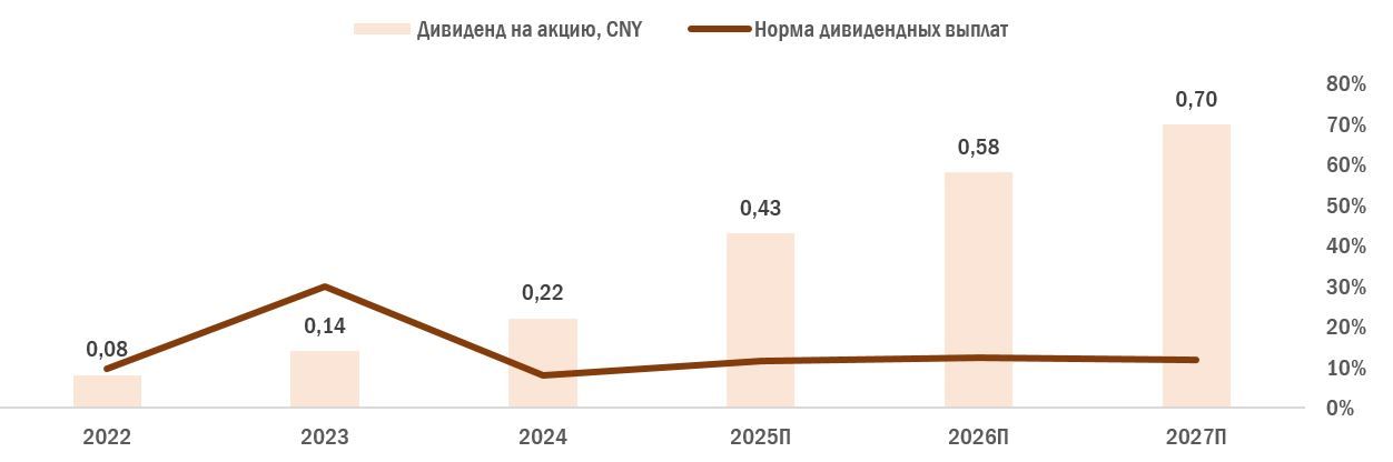 Will Semiconductor платит стабильные, хотя и невысокие дивиденды. В последние годы компания выплачивала дивиденды чаще всего в размере 10–12% от чистой прибыли. По нашим оценкам, размер выплат в ближайшие 12 месяцев составит CNY 0,43 на акцию, что соответствует дивидендной доходности на уровне 0,34%.