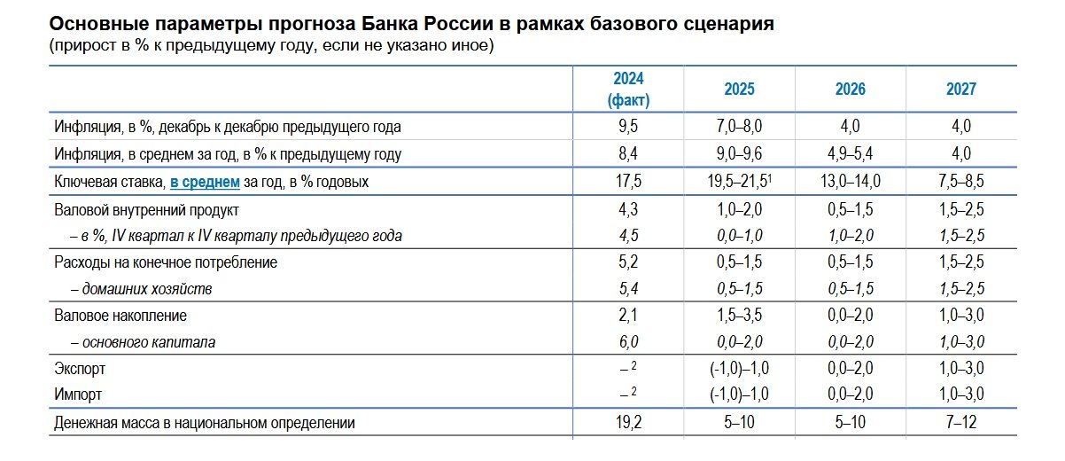 Согласно прогнозу самого Банка России, ключевая ставка в 2025 году должна находиться в диапазоне 19,5%-21,5%. «Очевидно, что в этом году, как минимум, ЦБ сохранит жесткую денежно-кредитную политику, опасаясь новой волны роста инфляции в случае ощутимого снижения ключевой ставки. При сохранении текущих дезинфляционных факторов Банк России сможет приблизиться к уровню ключевой ставки в 19% скорее всего осенью 2025 года», - полагает Артем Люкшин.
