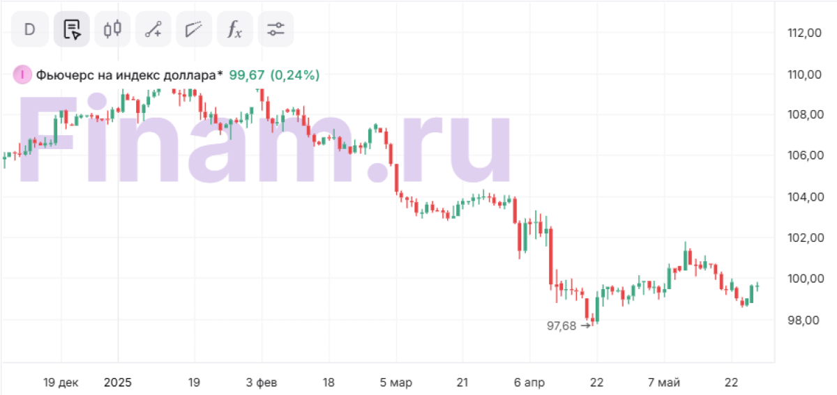 С тех пор как президент США Дональд Трамп вернулся в Белый дом 20 января 2025 года, индекс доллара упал примерно на 10% по состоянию на 28 мая.