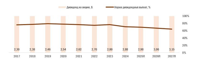 Southern Company остается стабильным дивидендным плательщиком. Компания увеличивает дивиденды уже 24-й год подряд, а выплаты не снижались в течение 78 лет. В прошлом месяце Совет директоров ожидаемо одобрил увеличение дивиденда на 8 центов — до $2,96 в год. По нашим оценкам, в течение следующих 12 месяцев дивиденд может составить $2,98, что соответствует доходности на уровне 3,3% — выше среднего по коммунальному сектору США.