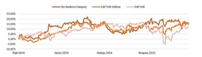 За последние 12 месяцев акции Southern Company показали уверенную динамику. Котировки компании, как и отраслевой индекс S&P 500 Utilities, выросли на 14,3%, тогда как широкий рынок (индекс S&P 500) прибавил 11,8%. На графике видно, что наибольший рост акций пришелся на периоды снижения ключевой ставки ФРС, а также на март — апрель 2025 года — время тарифной нестабильности.