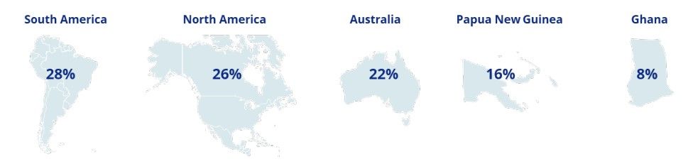 Активы компании хорошо диверсифицированы географически и расположены в регионах с низкими политическими рисками. Порядка 26% запасов — в Северной Америке (США, Канада и Мексика), 28% — в Южной Америке (Перу, Суринам, Аргентина, Доминиканская Республика), 22% — в Австралии, 16% — в Папуа — Новой Гвинее и 8% — в Африке (Гана).
