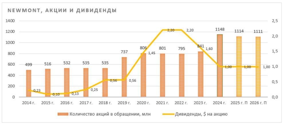 Компания выплачивает дивиденды ежеквартально. После слияния с Newcrest Mining количество акций увеличилось, а величина дивиденда сократилась и составила на акцию в 2024 г. $1 за год, $0,25 в квартал. По результатам 1К 2025 также были объявлены дивиденды в размере $0,25 на акцию.