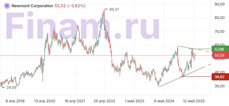 На недельном графике котировки акции Newmont демонстрирую высокую степень волатильности, упав почти в 3 раза, с $87 в 2022 г. до $30 в первой половине 2024 г., а затем выросли почти в 2 раза, до $58,5. В 2025 г. можно ожидать консолидации стоимости акций Newmont в диапазоне между $50 и $60.