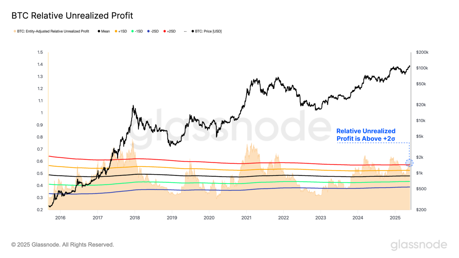 По расчетам аналитиков, рост цены к ATH вызвал скачок нереализованной прибыли выше двух стандартных отклонений. Исторически это сигнализировало о входе рынка в фазу эйфории.