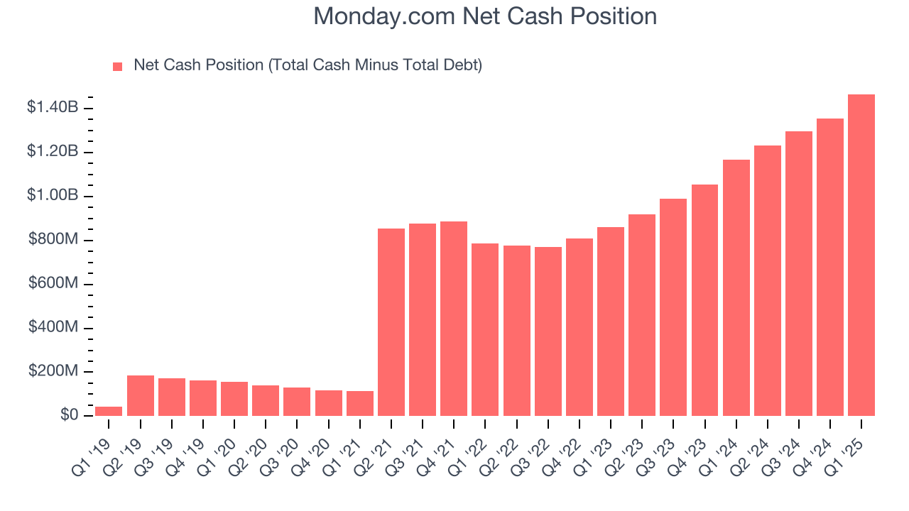 Monday.com – это хорошо капитализированная компания, на балансе которой находится $1,59 млрд наличных средств и $122,5 млн долга. Чистая денежная позиция в размере $1,47 млрд составляет 10,3% от рыночной стоимости компании и позволяет ей свободно занимать деньги, возвращать капитал акционерам или инвестировать в инициативы роста. Кредитное плечо здесь не проблема.
