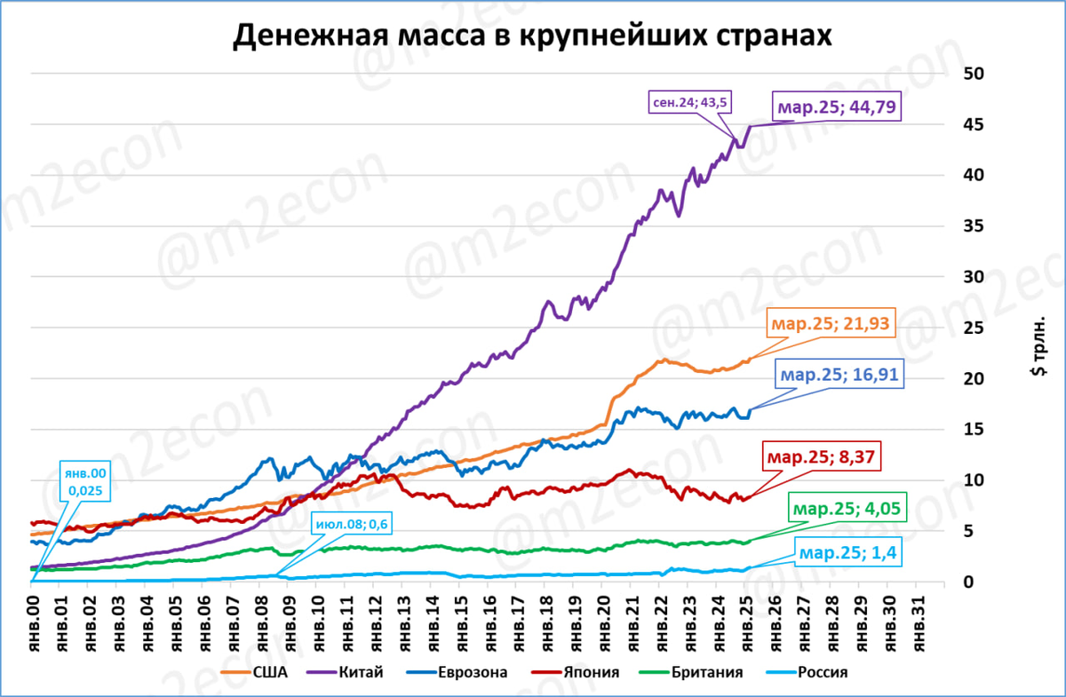 По объёму денежной массы в мире лидирует Китай: 45 трлн в пересчёте на доллары США. На втором месте США (22 трлн), на третьем – Еврозона (17 трлн). Россия с результатом 1,4 трлн на фоне лидеров смотрится карликом.