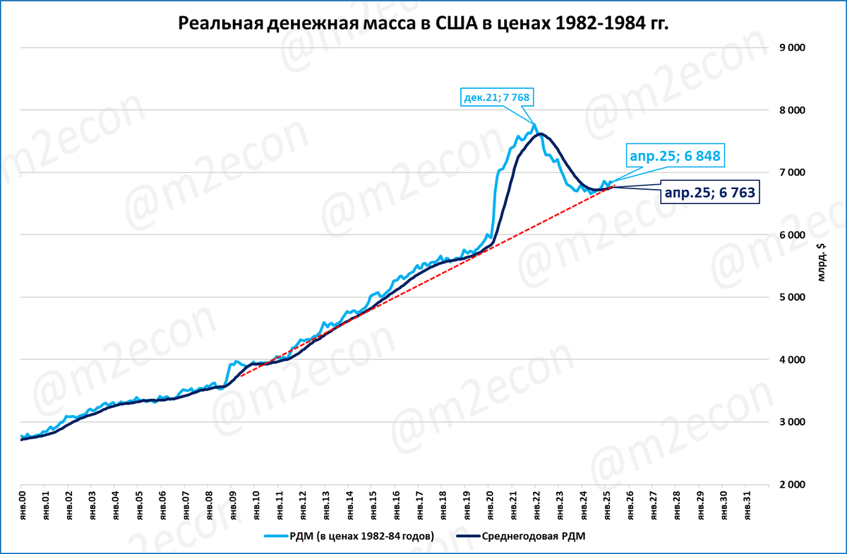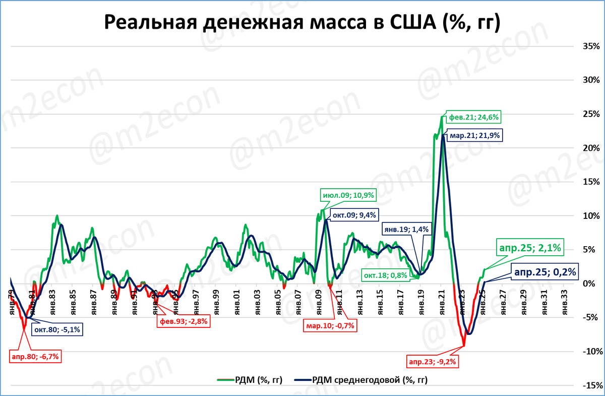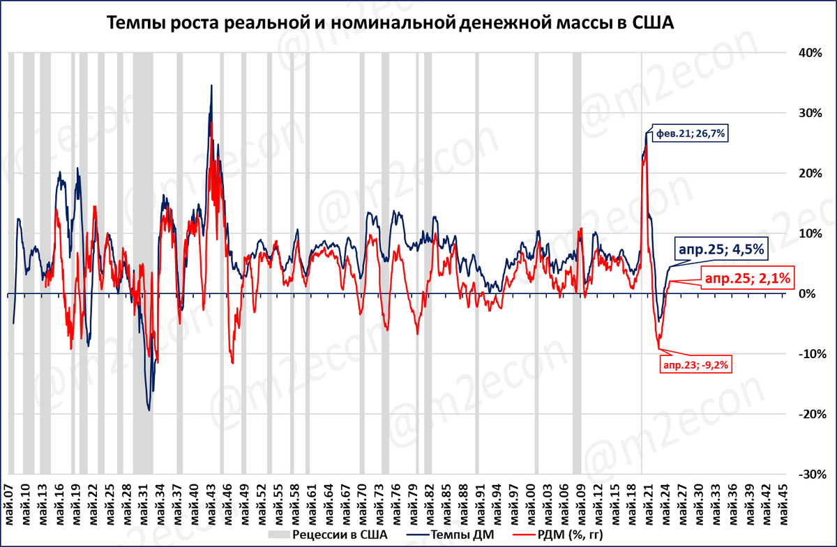 Денежная масса в США по итогам апреля выросла на 4,5%. Пятый месяц она растет быстрее цен (= растёт в реальном выражении). Сжатие реальной денежной массы (РДМ), продолжавшееся до этого 29 месяцев подряд закончилось.