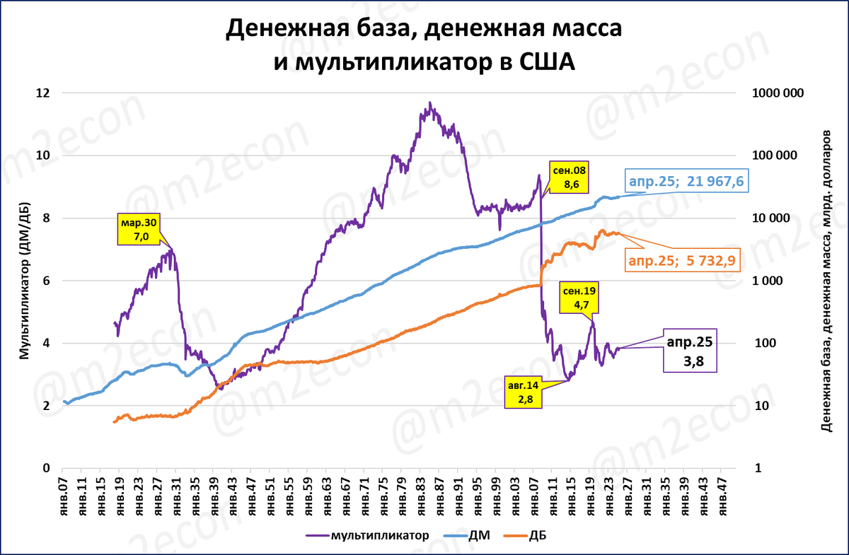 Отношение денежной массы к денежной базе в США (это и есть мультипликатор) в ходе многочисленных раундов количественного смягчения в 2008-2013 годах и ещё одного гигантского смягчения в 2020 году снизилось до 4.