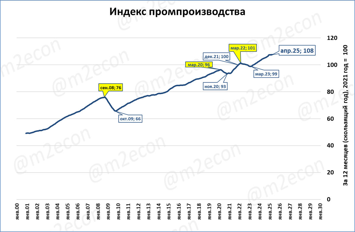 Несмотря на низкие темпы роста, показатель обновляет исторические рекорды. За последние 12 месяцев (скользящий год) объём промпроизводства составил 108% от уровня 2021 года.