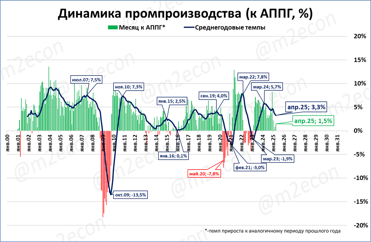 Промпроизводство в апреле выросло на 1,5% к апрелю прошлого года. Темпы чуть лучше, чем в феврале (+0,2%) и марте (+0,8%), но всё равно низки. Замедление роста очевидно.