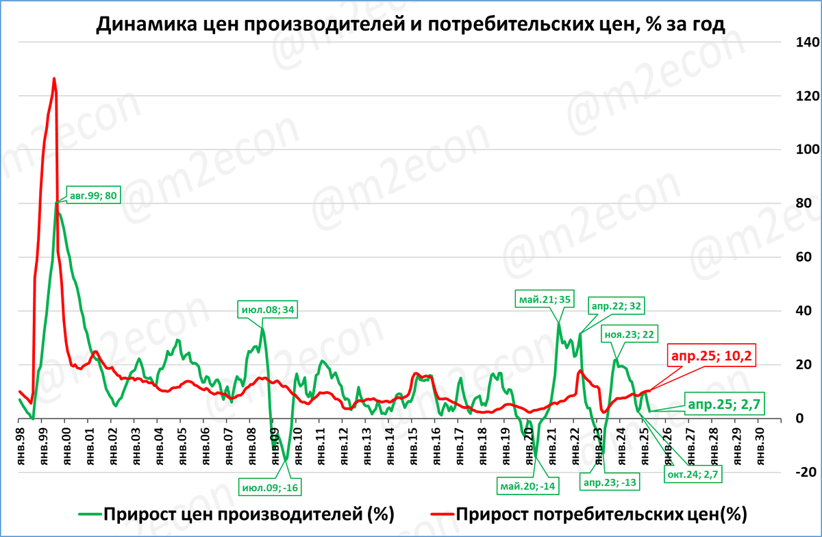 Обратите внимание: все кризисы в России (1998, 2008, 2015 и др.) сопровождаются падением цен производителей в реальном выражении.