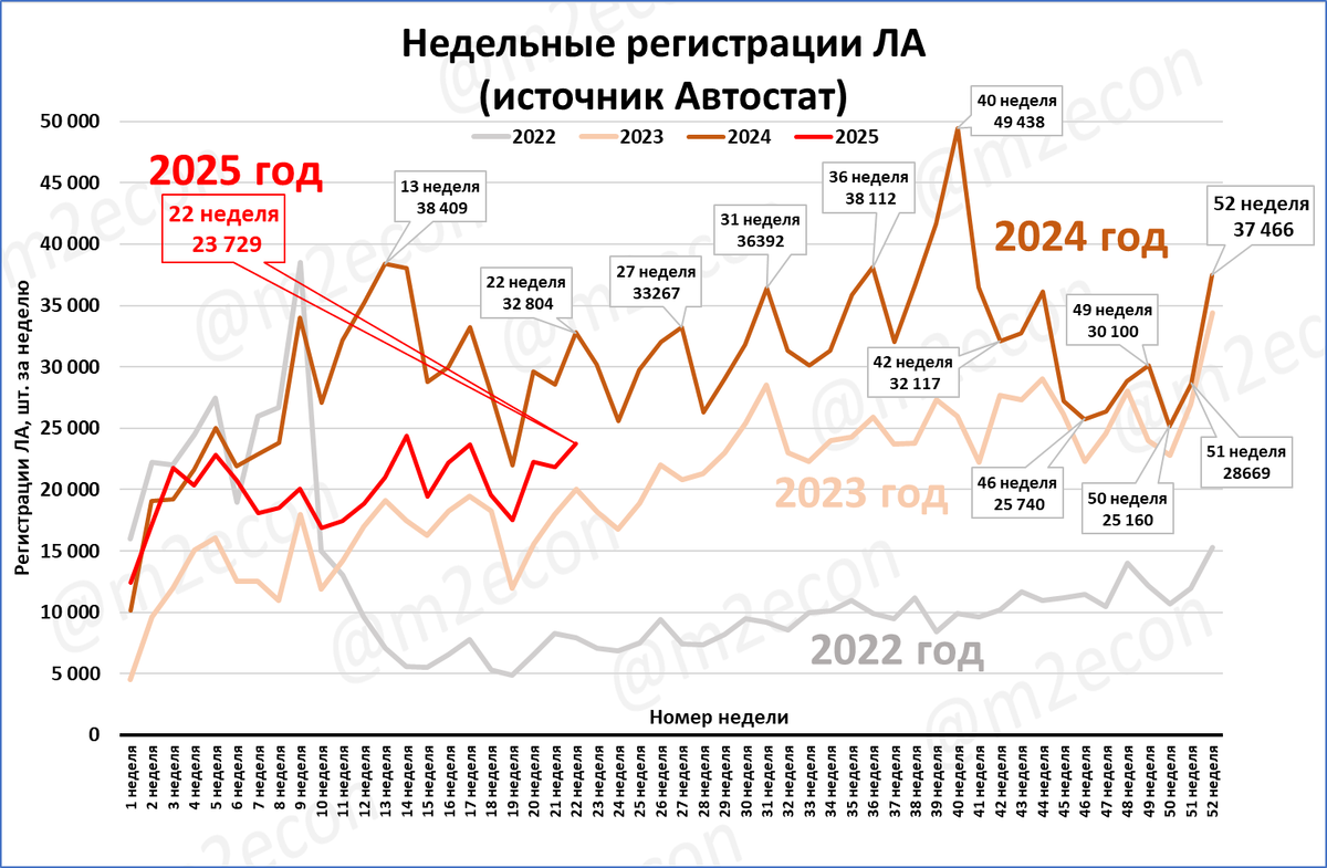 По данным агентства «Автостат», регистрации легковых автомобилей на 22 неделе составили 23,7 тыс.