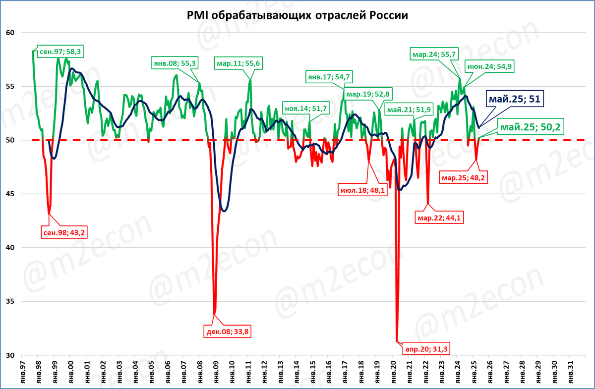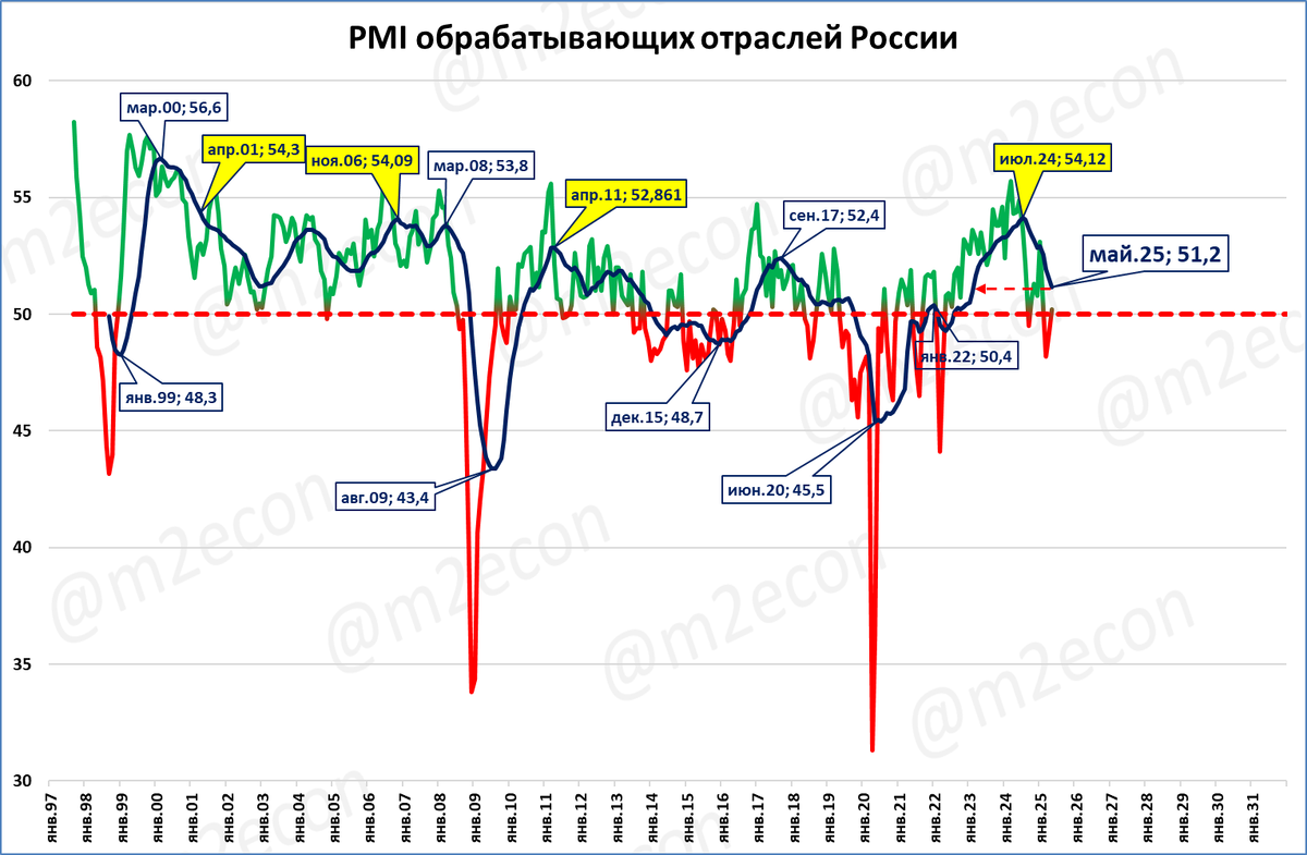 Не падение. Отметим, что в 2021 году индекс большую часть времени находился ниже 50 пунктов. И это не помешало экономике России вырасти в том году на 6%.