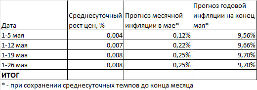 С 1 по 26 мая среднесуточный рост цен составил 0,008%.