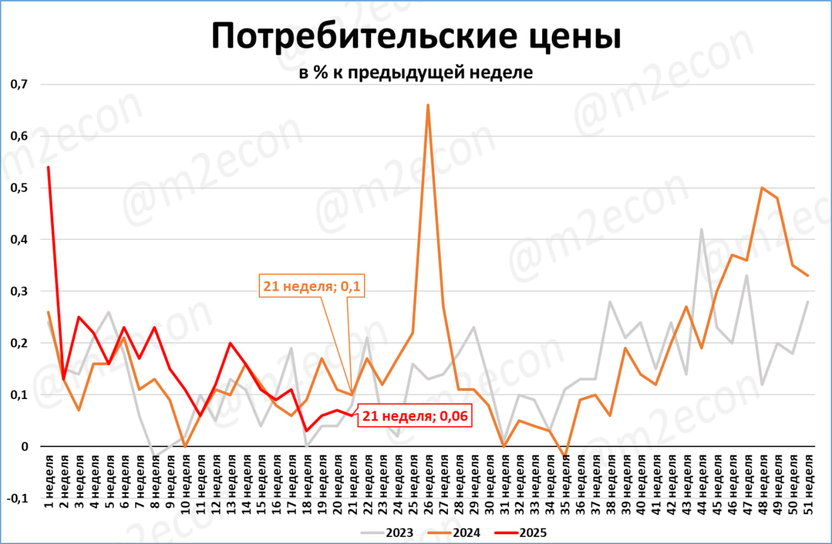 Инфляция на 21-й неделе (0,06%) заметно ниже инфляции 21-й недели 2024 года (0,1%).
