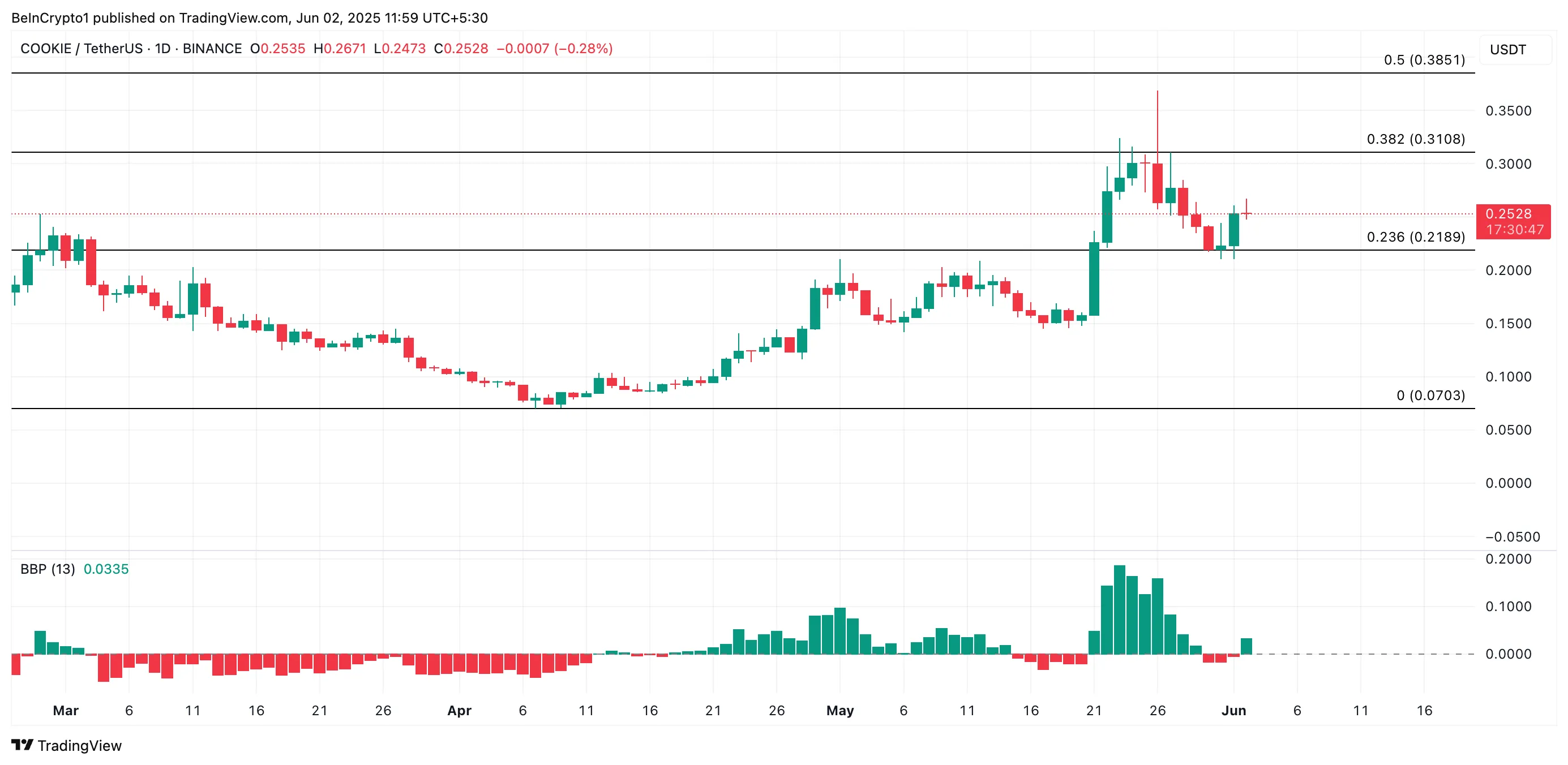 Индекс Elder-Ray оценивает силу быков и медведей на рынке, анализируя разницу между ценой актива и его экспоненциальной скользящей средней (EMA). Это сигнал о возобновлении покупательского давления, подтверждающий доминирование быков и рост спроса на альткоин. Это означает, что цена COOKIE может продолжить укрепляться в ближайшее время в направлении отметки $0,31. С другой стороны, если покупательская активность ослабнет, стоимость токена может упасть до $0,21.