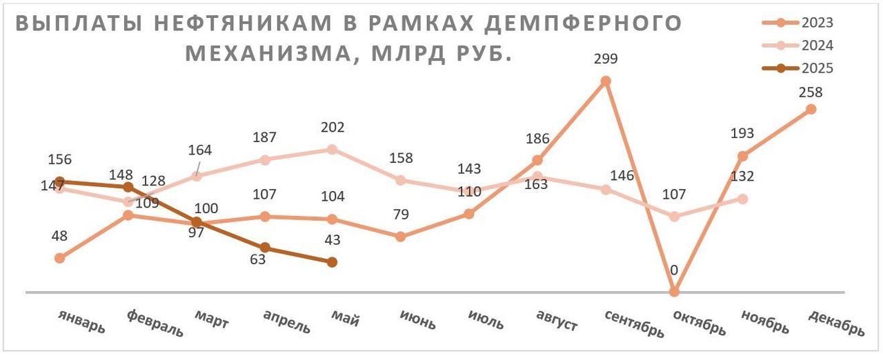 Ухудшается ситуация и в нефтепереработке, что косвенно можно отследить по выплатам в рамках демпферного механизма, которые в мае опустились на 43 млрд руб. — минимум с 2021 года, если не учитывать один месяц нулевых выплат. «Газпром нефть» особенно сильно зависит от данного направления, так как компания более значительную долю добываемой нефти направляет на переработку и отличается высокой эффективностью своих НПЗ. Например, Омский НПЗ имеет глубину переработки 100%. За счет эффективной переработки в 2022–2024 гг., когда конъюнктура была благоприятной, «Газпром нефть» получала дополнительную прибыль, однако в период нормализации маржинальности данного сегмента это приводит к негативной динамике прибыли и EBITDA в годовом выражении.