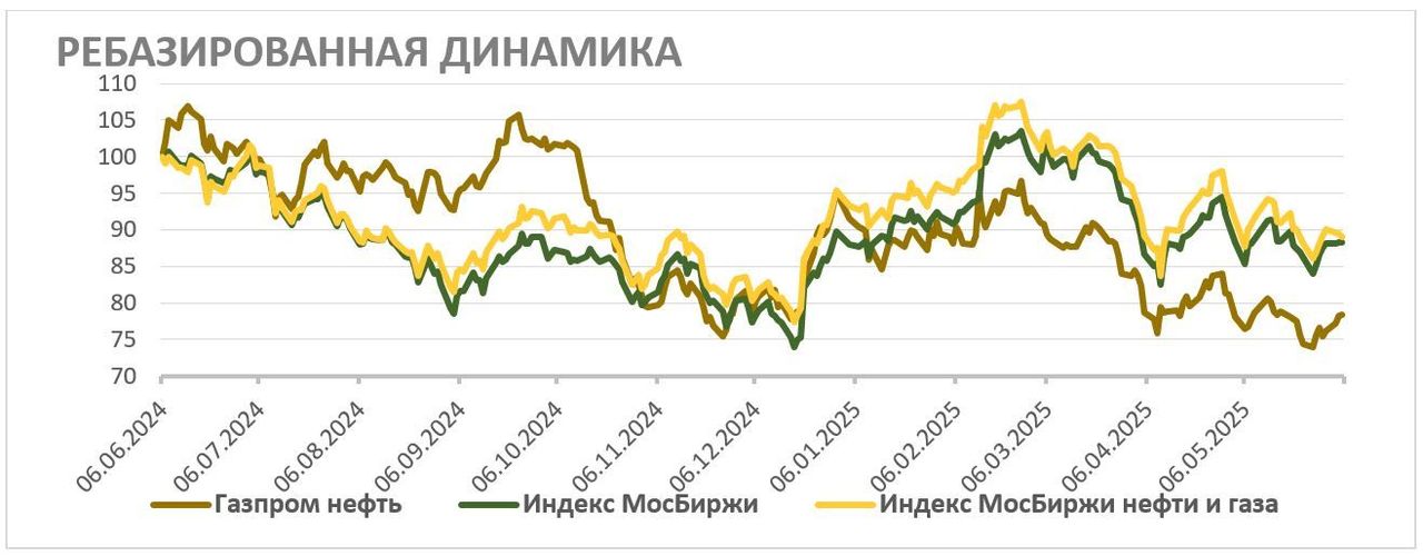 Основным негативным фактором, который локально давит на бизнес «Газпром нефти», является снижение рублевых цен на нефть. Цены на нефть марки Brent стабилизировались около $65 за баррель на фоне достаточно быстрого роста добычи со стороны ОПЕК+ и влияния торговых войн. Саудовская Аравия на данный момент решительно настроена хотя бы частично восстановить свою долю на рынке, в связи с чем устойчивое возвращение цен в диапазон $70–80 за баррель выглядит маловероятным. При этом рубль проявляет аномальную для периода снижения цен на нефть крепость, в результате чего в мае рублевая стоимость Urals опустилась до 4,2 тыс. руб. за баррель — минимум с весны 2023 года. В условиях растущего дефицита бюджета мы считаем текущие рублевые цены неустойчивыми, однако их восстановление до уровней начала года считаем маловероятным, в связи с чем конъюнктура на рынке нефти, вероятно, продолжит давить на показатели «Газпром нефти» в ближайшие кварталы.