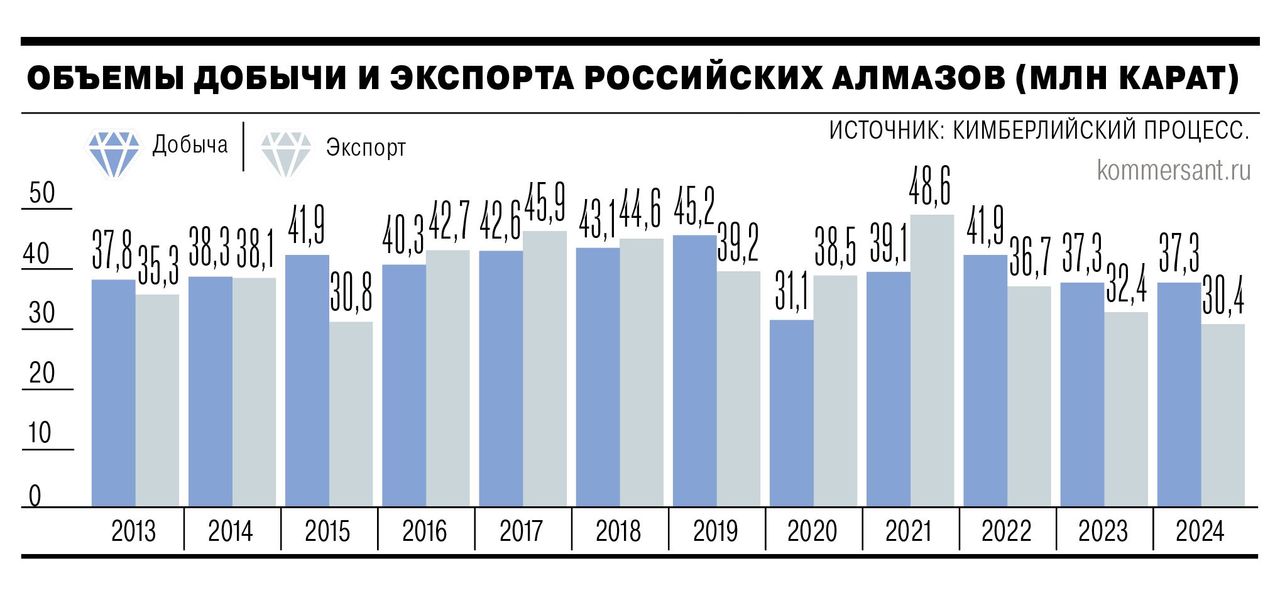 В глобальном масштабе экспорт алмазов в 2024 году снизился в натуральном выражении на 7,21% — до 284,9 млн карат и в денежном на 16,8% — до $30 млрд. На фоне этого доля России в мировом экспорте алмазов в натуральном выражении осталась на уровне 11%, а в денежном — снизилась с 10% до 9%. При этом страна в 2024 году обеспечила 32% мировой добычи алмазов против 33% годом ранее — 37,32 млн карат.