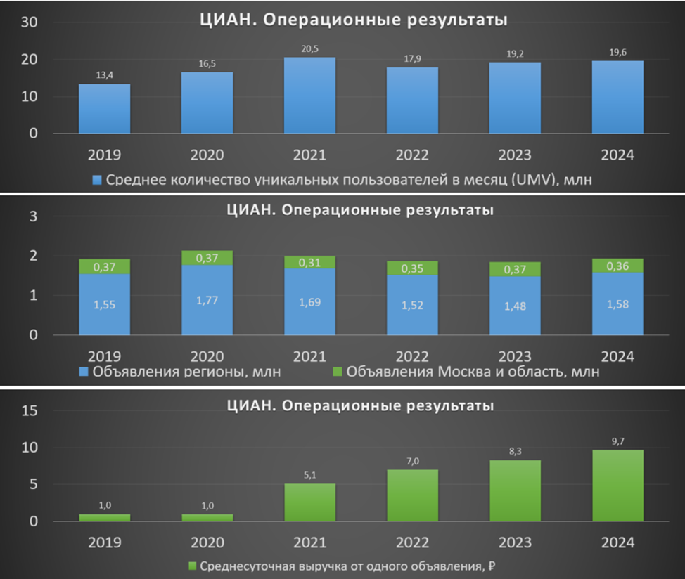 Количество пользователей и объявлений стабильно уже несколько лет. Но компания регулярно повышает тарифы, поэтому растет среднесуточная выручка от одного объявления.
