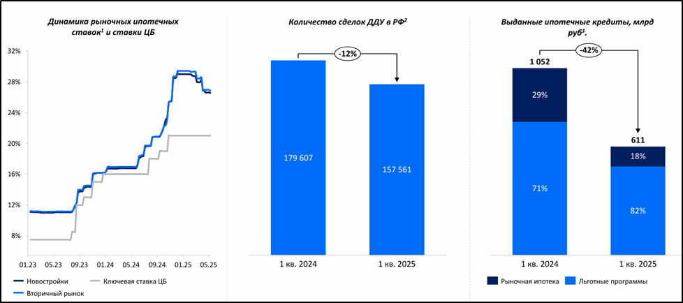 Внешние рыночные условия для компании неблагоприятные. С 01.07.2024 отменена массовая программа льготной ипотеки. Текущие ипотечные ставки запредельны. В итоге, в 1Q 2025 количество сделок ДДУ упало на 12% г/г.