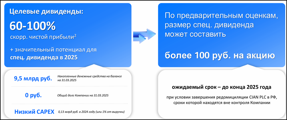 Кроме того, после завершения редомициляции, ЦИАН может рассмотреть возможность выплаты специальных дивидендов за счет распределения накопленных денежных средств. Это может произойти не ранее 2П 2025г.
