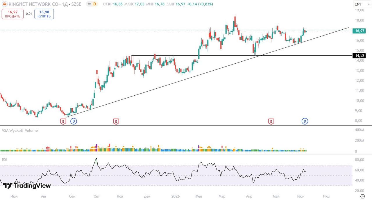 На дневном графике акции четко двигаются по глобально восходящей трендовой линии начиная с сентября прошлого года. При пробитии этой линии главным уровнем поддержки будет 14,5 юаня.