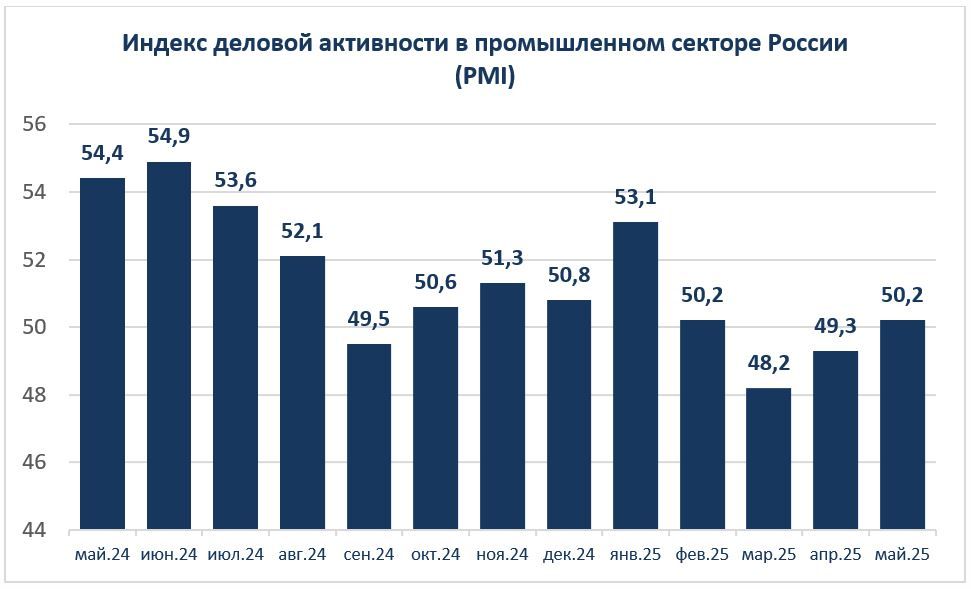 В мае 2025 года российский промышленный сектор продемонстрировал умеренное восстановление: индекс деловой активности (PMI), по данным S&P Global, вырос до 50,2 с 49,3 в апреле. Это указывает на незначительное улучшение производственной конъюнктуры после снижения с начала года. Основным фактором стало увеличение внутренних заказов — их рост стал самым быстрым с начала года благодаря активизации спроса со стороны клиентов и привлечению новых заказчиков.