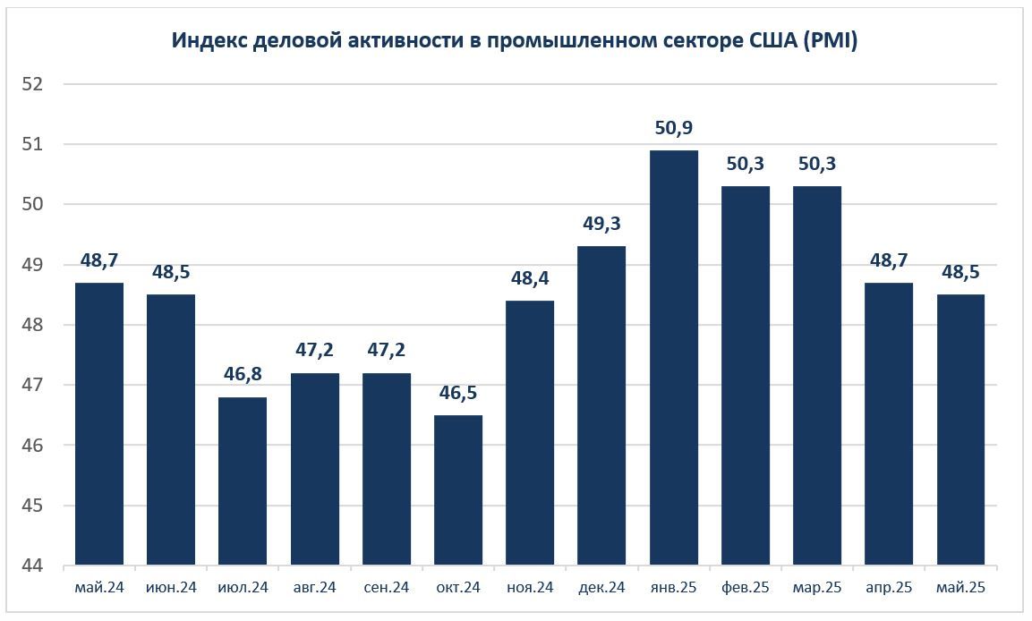 В мае 2025 года объем промышленного производства продолжил сокращаться: согласно данным Института управления поставками (ISM), индекс деловой активности (PMI) снизился до 48,5 — это шестимесячный минимум и явный признак сжатия сектора. Производство в США оказалось под давлением новых импортных пошлин, которые вызвали рост цен на ресурсы и нарушили стабильность цепочек поставок. Это особенно затронуло металлообрабатывающую и машиностроительную отрасли, где зависимость от иностранных компонентов выше среднего.
